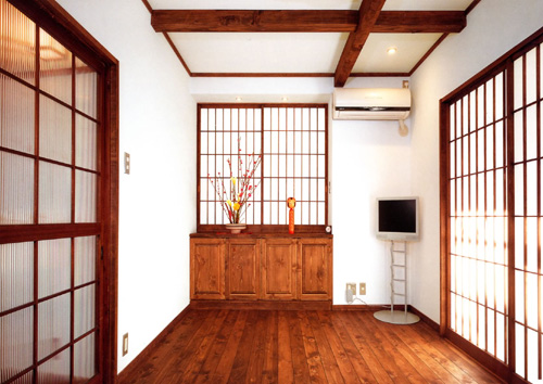 ヒノキの無垢剤の床、漆喰の壁などエコ素材を積極的に活用したリビングダイニング。天井には、縦に走る構造上必要な梁の他に、化粧梁を2本取り付けています。